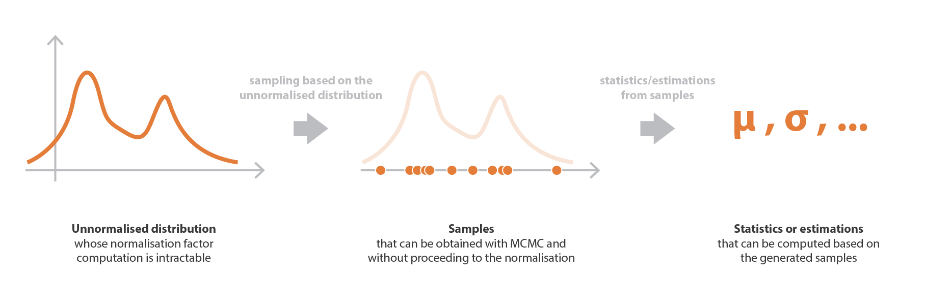 The main idea of the Metropolis–Hastings algorithm is to start with a random value (input, x-value) and in each step decide whether to stay at this value or move on to some value in the near neighborhood (left or reight).